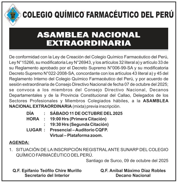 𝗔𝘁𝗲𝗻𝗰𝗶𝗼́𝗻, 𝗺𝗶𝗲𝗺𝗯𝗿𝗼𝘀 𝗱𝗲𝗹 𝗖𝗤𝗙𝗣! Convocamos a la Asamblea Nacional Extraordinaria del Colegio Químico Farmacéutico del Perú, que se llevará a cabo: Fecha: Sábado, 11 de Octubre del 2025 Hora: 19:00 Hrs (Primera Citación) 19:30 Hrs (Segunda Citación) Lugar : * PRESENCIAL : AUDITORIO DEL CQFP * VIRTUAL :Plataforma virtual del CQFP vía ZOOM Convocatoria: Miembros […]