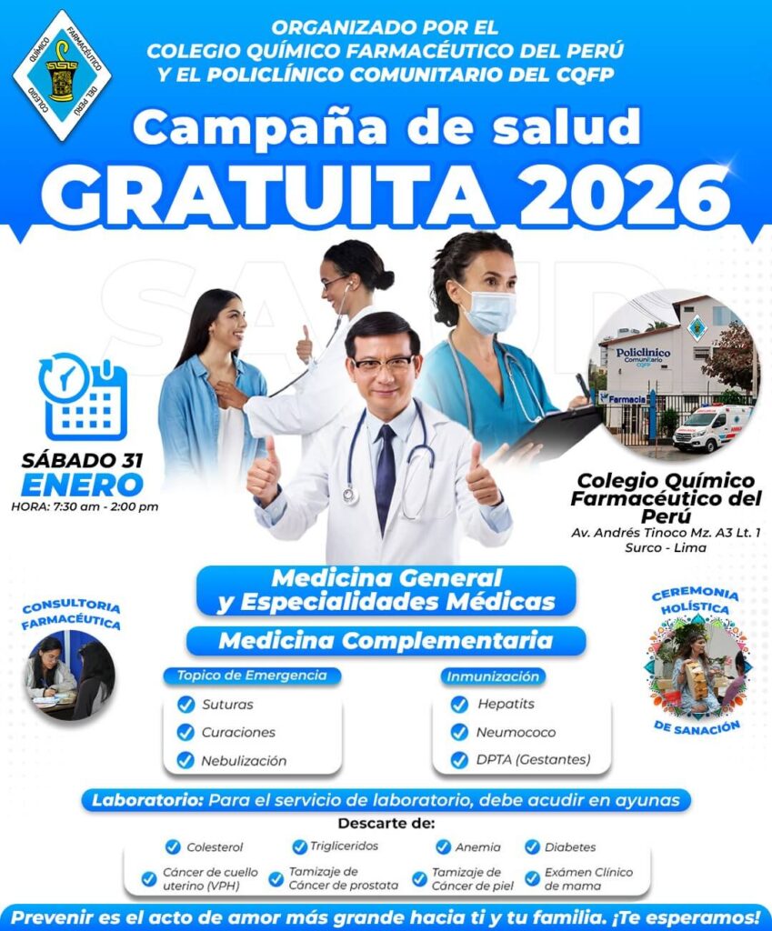 𝗖𝘂𝗶𝗱𝗮𝗿 𝘁𝘂 𝘀𝗮𝗹𝘂𝗱 𝘁𝗮𝗺𝗯𝗶𝗲́𝗻 𝗲𝘀 𝘂𝗻 𝗮𝗰𝘁𝗼 𝗱𝗲 𝗮𝗺𝗼𝗿 El Colegio Químico Farmacéutico del Perú te invita a ser parte de la Campaña de Salud GRATUITA 2026, una iniciativa pensada para cuidar tu bienestar y el de tu familia. Sábado 31 de enero 7:30 a. m. – 2:00 p. m. Colegio Químico Farmacéutico del Perú […]