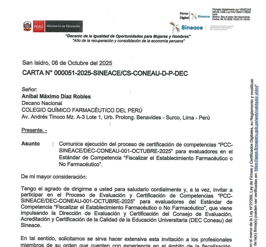 Comunicado ejecución del proceso de certificación de «PCC-SINEACEDEC-CONEAU-001-OCTUBRE 2025» para evaluadores en el Estándar de Competencias «Fiscalizar el Establecimiento Farmacéutico o No Farmacéutico»