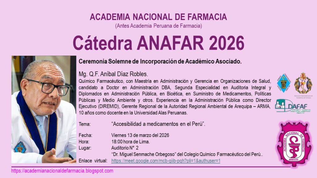 La Academia Nacional de Farmacia invita a la comunidad a participar en la Cátedra ANAFAR 2026, en el marco de la incorporación como Académico Asociado del Aníbal Díaz Robles.
